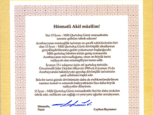 Təbrikdə deyilir:” Hörmətli Akif müəllim!
