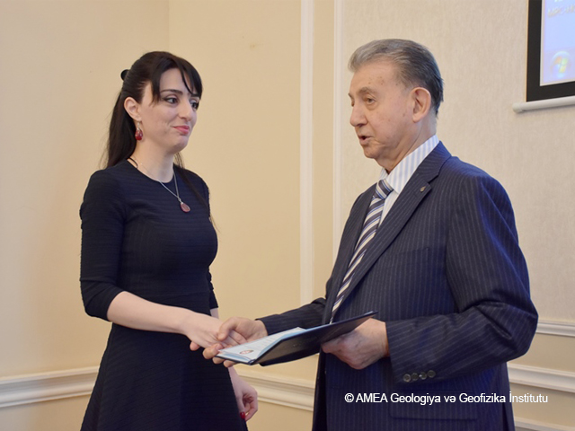 Geologiya və Geofizika İnstitunun direktoru akademik Akif Əlizadə müəssisənin Elmi Şurasının son iclasında Yer elmləri üzrə fəlsəfə doktoru diplomunu Əzizə Əliyevaya təqdim etmişdir.